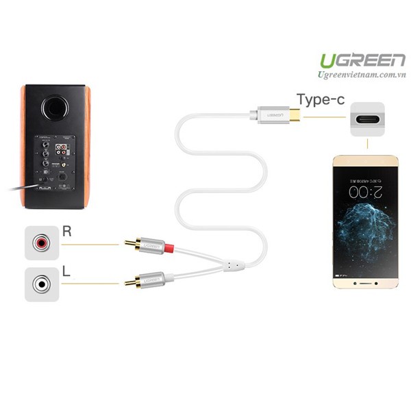Cáp chuyển đổi USB Type C to RCA chính hãng Ugreen 30734 cao cấpLoại cáp USB Ugreen Type-C sang RCA stereo splitter, giúp chuyển đổi âm thanh từ cổng USB-C sang cổng RCA ( hoa sen R/L) để các bạn có thể thưởng thức âm thanh với chất lượng hay nhất.