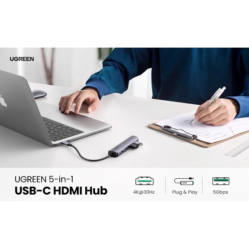 Bộ chuyển đổi đa cổng USB C Hub Ugreen 20197 đi kèm với một cổng HDMI để kết nối với màn hình HDMI, độ phân giải lên đến 4K @ 30Hz.