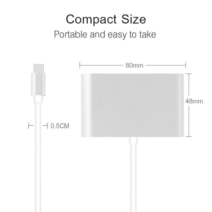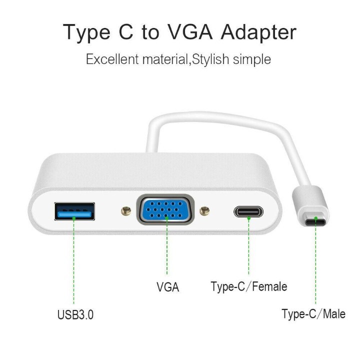 CÁP CHUYỂN TYPE C SANG USB 3.0 VGA ADAPTER TỪ LAPTOP, MÁY TÍNH BẢNG CỔNG TYPE C RA TV, MÁY CHIẾU CỔNG VGA- CÁP CHUYỂN ĐỔI TỪ USB-C SANG USB 3.0/VGA-TYPE C CÓ THIẾT KẾ NHỎ GỌN, DỄ DÀNG MANG THEO BÊN MÌNH, CHỈ CẦN CẮM CÁP VÀO THIẾT BỊ LÀ BẠN CÓ THỂ SỬ DỤNG ĐƯỢC NGAY TỨC THÌ - THIẾT BỊ GIÚP CHUYỂN KẾT NỐI TỪ ĐẦU VÀO USB TYPE C SANG KẾT NỐI USB 3.0 HỖ TRỢ TRUYỀN TẢI DỮ LIỆU TỐC ĐỘ TỐI ĐA LÊN ĐẾN 600MB/S - KẾT NỐI VGA Ở ĐỘ PHÂN GIẢI 1080P Ở 60HZ VÀ ĐỘ PHÂN GIẢI LÊN TỚI UHD (3840 X 2160) Ở TẦN SỐ 30HZ - CỔNG TYPE C HỖ TRỢ CẤP NGUỒN CHO THIẾT BỊ - CÓ THỂ KẾT NỐI VỚI CÁC DÒNG SMARTPHONE CÓ HỖ TRỢ XUẤT VGA QUA CỔNG TYPE-C THIẾT KẾ NHỎ GỌN TỐC ĐỘ TRUYỀN DỮ LIỆU NHANH CẮM LÀ SỬ DỤNG NGAY CỔNG KẾT NỐI: TYPE C, VGA, USB 3.0