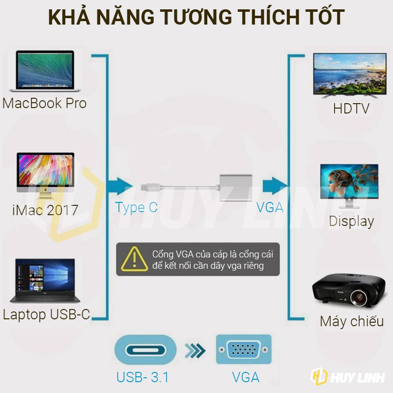 USB chuẩn USB3.1 Type-c là chuẩn usb mới ( usb 3.1 ) với khả năng thay thế cho 5 kết nối bao gồm HDMI, VGA, USB, DisplayPort và cổng sạc và còn có thể nhiều hơn nữa.Cáp chuyển đổi USB type C to VGA sở hữu tốc độ truyền tải dữ liệu của chuẩn USB 3.1 hiện nay, tối đa lên tới 10 Gbps, gấp đôi chuẩn 3.0 và tương đương với chuẩn Thunderbolt. Hơn nữa, USB-C cung cấp mức năng lượng cao hơn rất nhiều, truyền tải điện lên đến 100W.