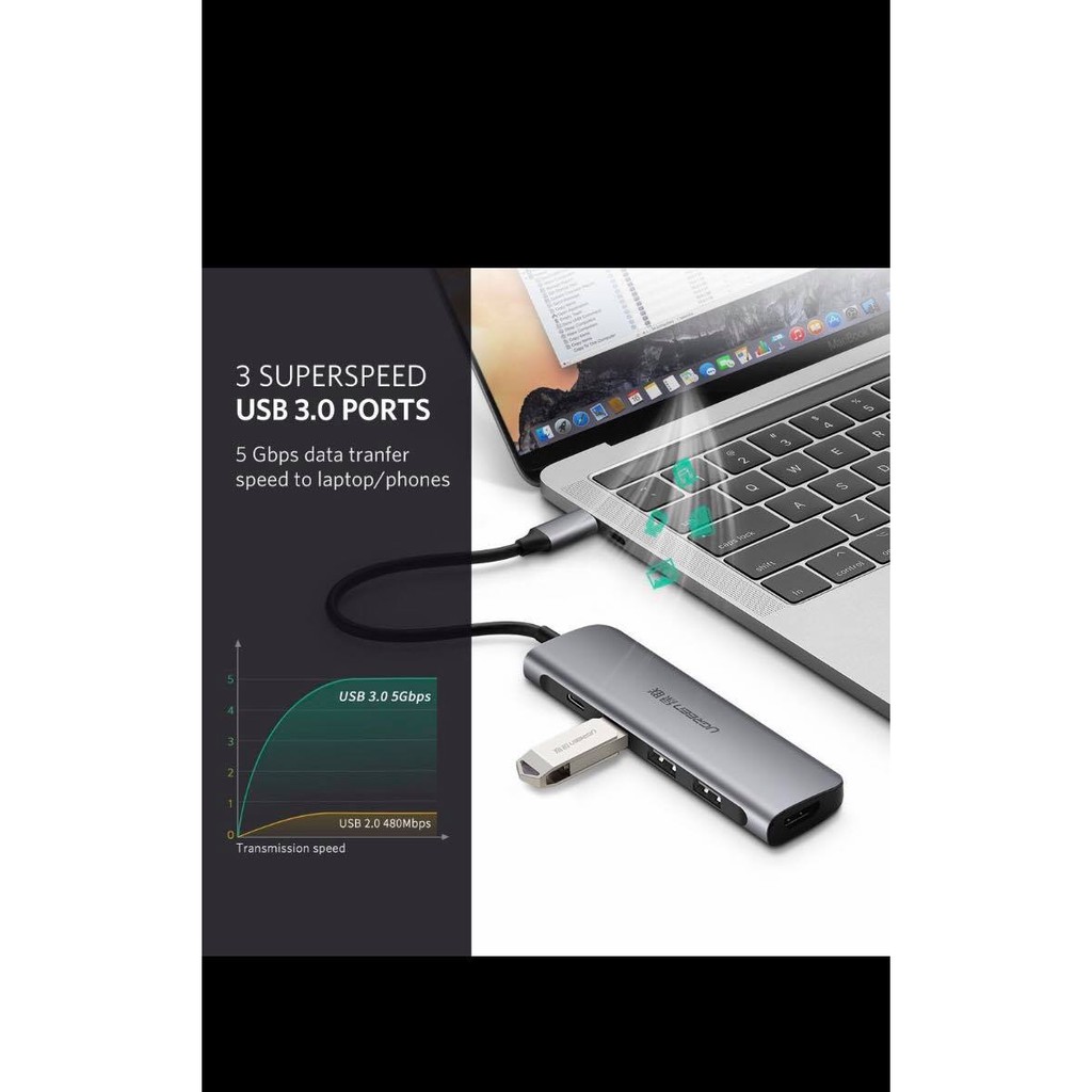 Bộ chuyển USB-C Ugreen 50209 hỗ trợ 3 cổng USB 3.0 tốc độ cao dùng để kết nối các thiết bị ngoại vi như chuột, bàn phím, ổ cứng di động với tốc độ truyền tải tín hiệu số lên đến 5Gbps. Ngoài ra, phụ kiện cao cấp này còn tích hợp thêm 1 cổng USB-C hỗ trợ công nghệ sạc PD giúp bạn có thể sạc, cấp nguồn ngay trên thiết bị, không ngại thiếu cổng kết nối.----------------------------------------------------------------------------------------------