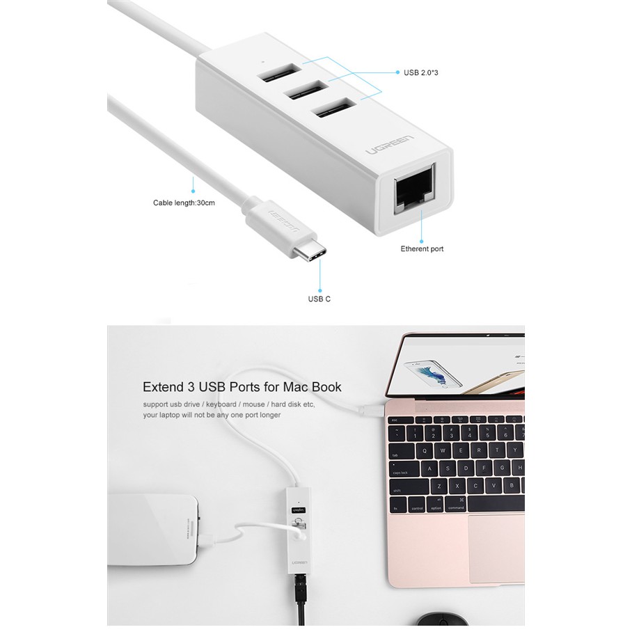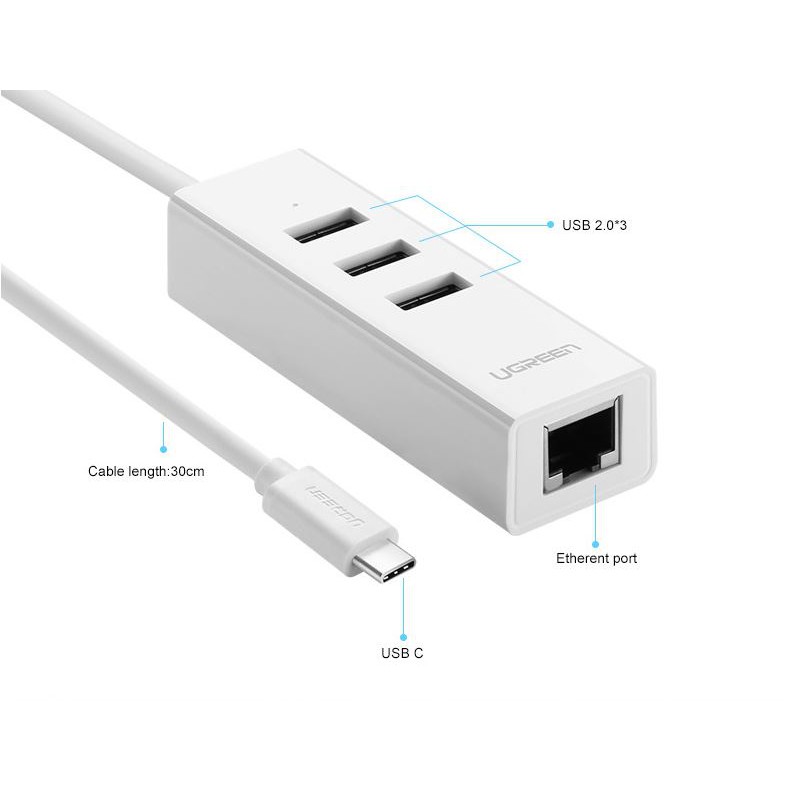 Cáp chuyển USB Type C to Lan+ USB hãng Ugreen 20792