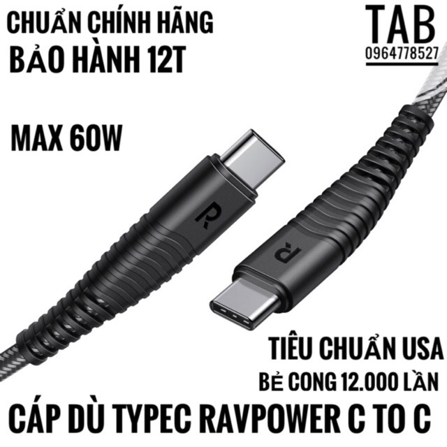 ✅ Cáp Dù Type C Ravpower Usb c To Usb C 1M Chính Hãng - Bảo Hành 12T ( RP-CB047)✅ Model: RP-CB047