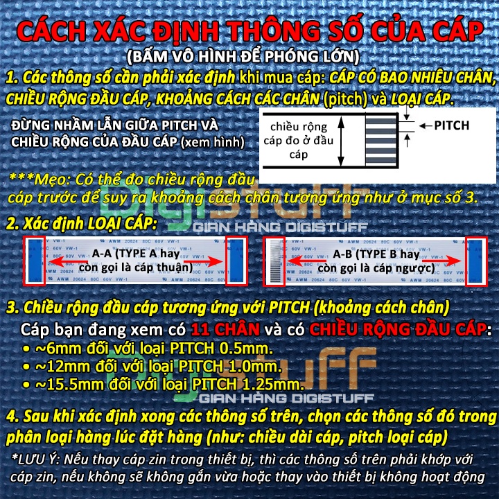 *** VUI LÒNG XEM THÔNG SỐ, HÌNH HƯỚNG DẪN, PHẢI BẢO ĐẢM CÁC THÔNG SỐ NÀY GIỐNG VỚI CÁP CŨ CỦA BẠN. CÁC THÔNG SỐ BẮT BUỘC PHẢI GIỐNG: SỐ CHÂN CỦA CÁP, LOẠI CÁP, CHIỀU RỘNG ĐẦU CÁP (đo chiều rộng đầu cáp trước, sau đó suy ra PITCH như trong hình hướng dẫn, lúc đặt hàng, chọn PITCH tương ứng).