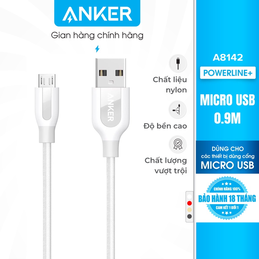 Điện Thoại & Phụ Kiện > Phụ kiện > Cáp, sạc & bộ chuyển đổi > Cáp & Bộ chuyển đổi di động || Cáp sạc ANKER PowerLine+ Micro USB dài 0.9m - A8142Còn hàng