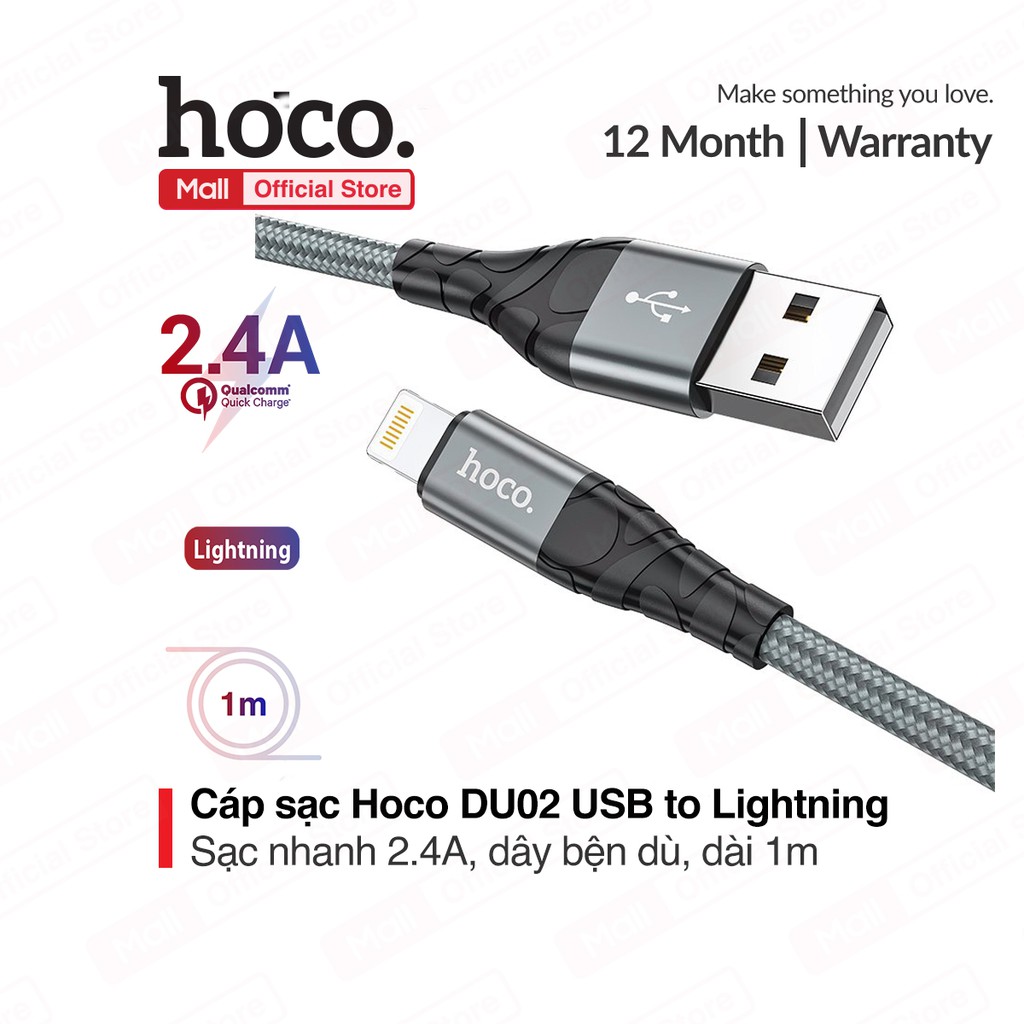 Cáp sạc Hoco DU02Cáp sạc Hoco DU02 USB to Lightning sạc nhanh 2.4A, sạc nhanh cho nhiều dòng iPhone/iPad, dây bền dù chống đứt, dài 100cm