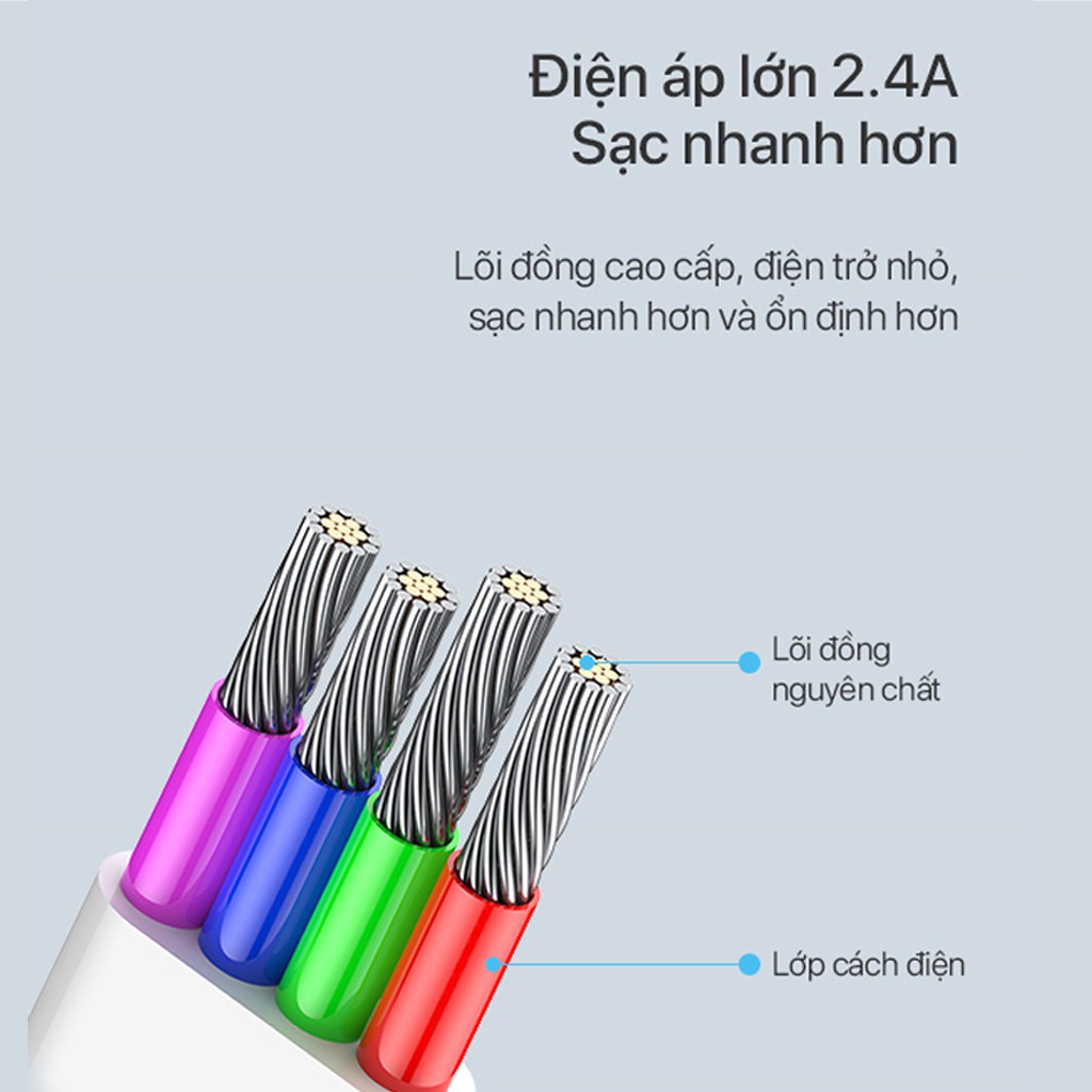 🟩 Lõi cáp chất liệu đồng cao cấp, điện trở nhỏ; nguồn ra 2A, 2.4A cho tốc độ truyền tải ổn định hơn