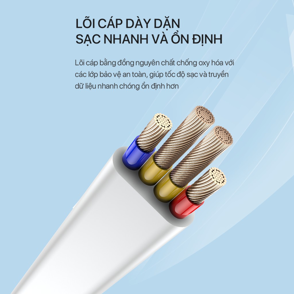 - Lõi cáp bằng đồng nguyên chất chống oxy hóa với các lớp bảo vệ an toàn, giúp tốc độ sạc và truyền dữ liệu nhanh chóng ổn định hơn.