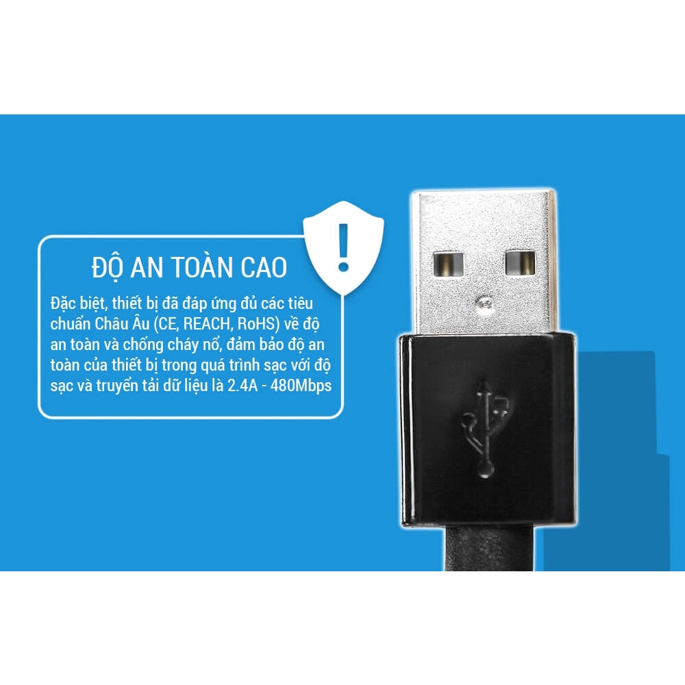 Đặc biệt, thiết bị đã đáp ứng đủ các tiêu chuẩn Châu Âu (CE, REACH, RoHS) về độ an toàn và chống cháy nổ, đảm bảo độ an toàn của thiết bị trong quá trình sạc với độ sạc và truyển tải dữ liệu là 2.4A - 480Mbps.