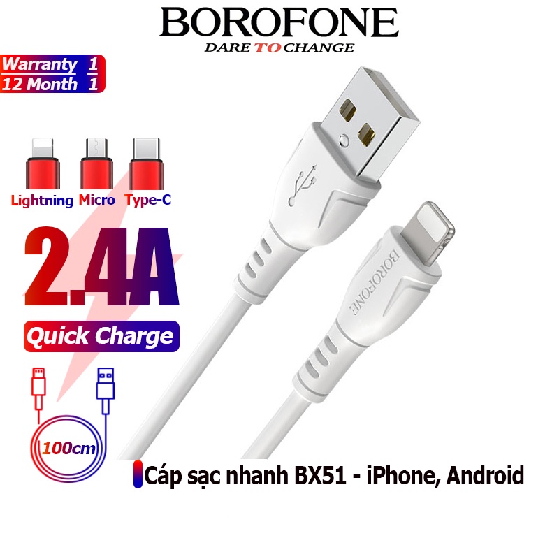 [Mã ELBOROMAY giảm 10% đơn 100K] Cáp sạc nhanh 2.4A BOROFONE BX51 chống rối đầu Lightning, Micro, Type-C 1m- Chính hãng
