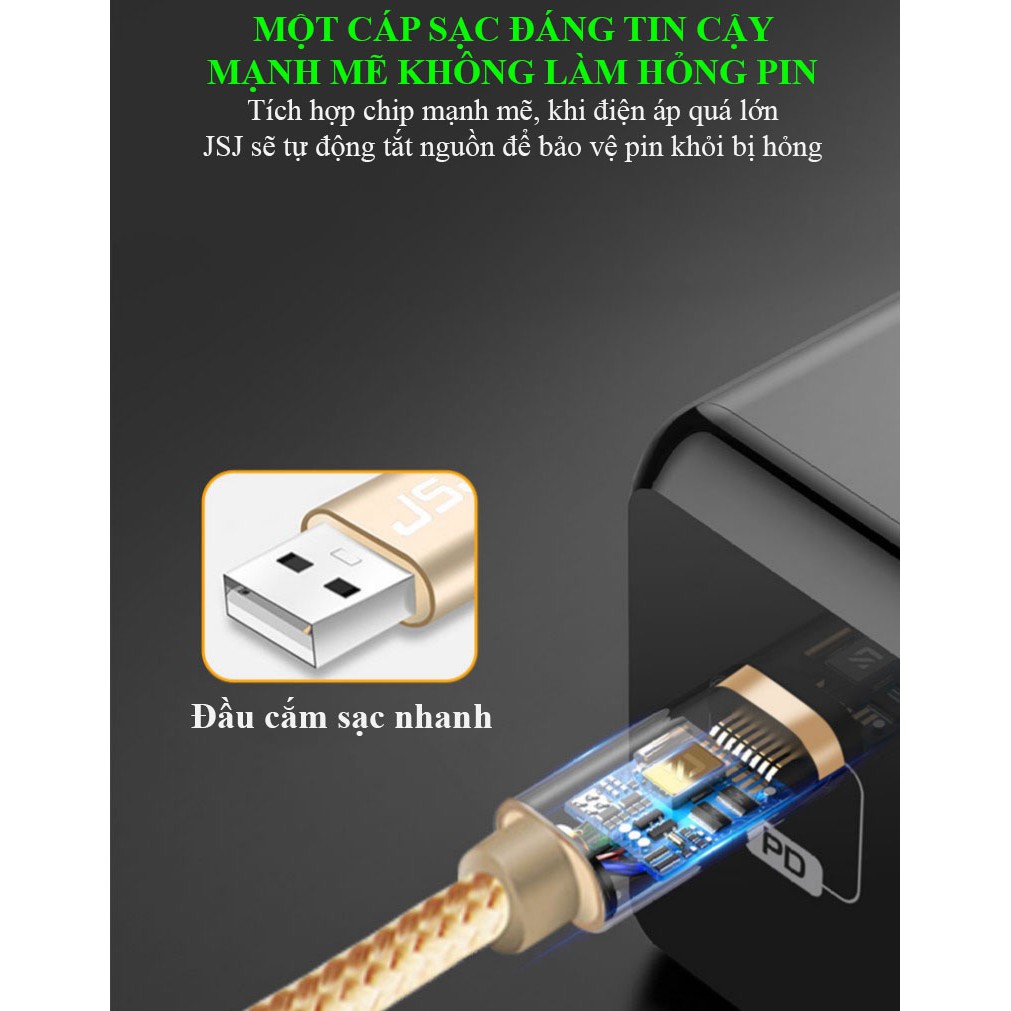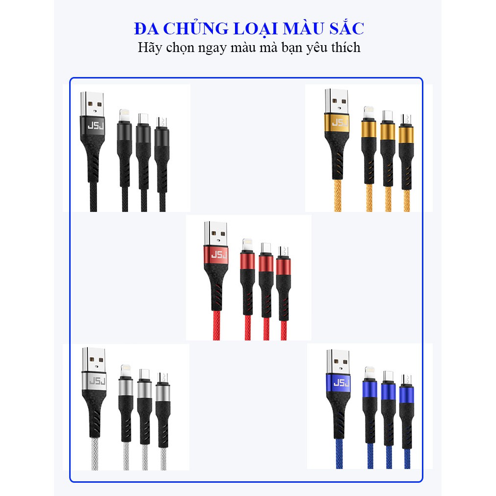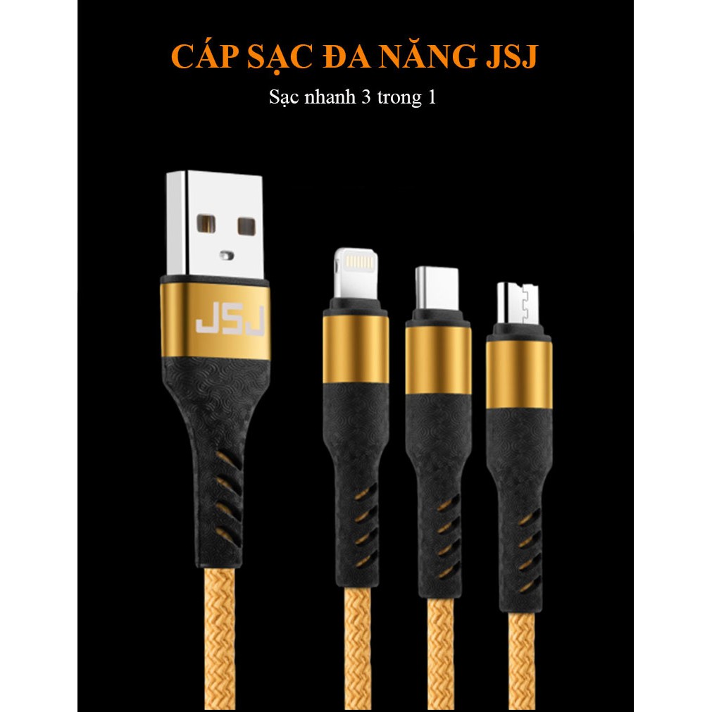 Cáp sạc nhanh 3 đầu (Type-C Micro USB Lightning) 3.0A JSJ USB-233 dài 1.2m sử dung chất liệu vải dù mềm phân đuôi cáp đư