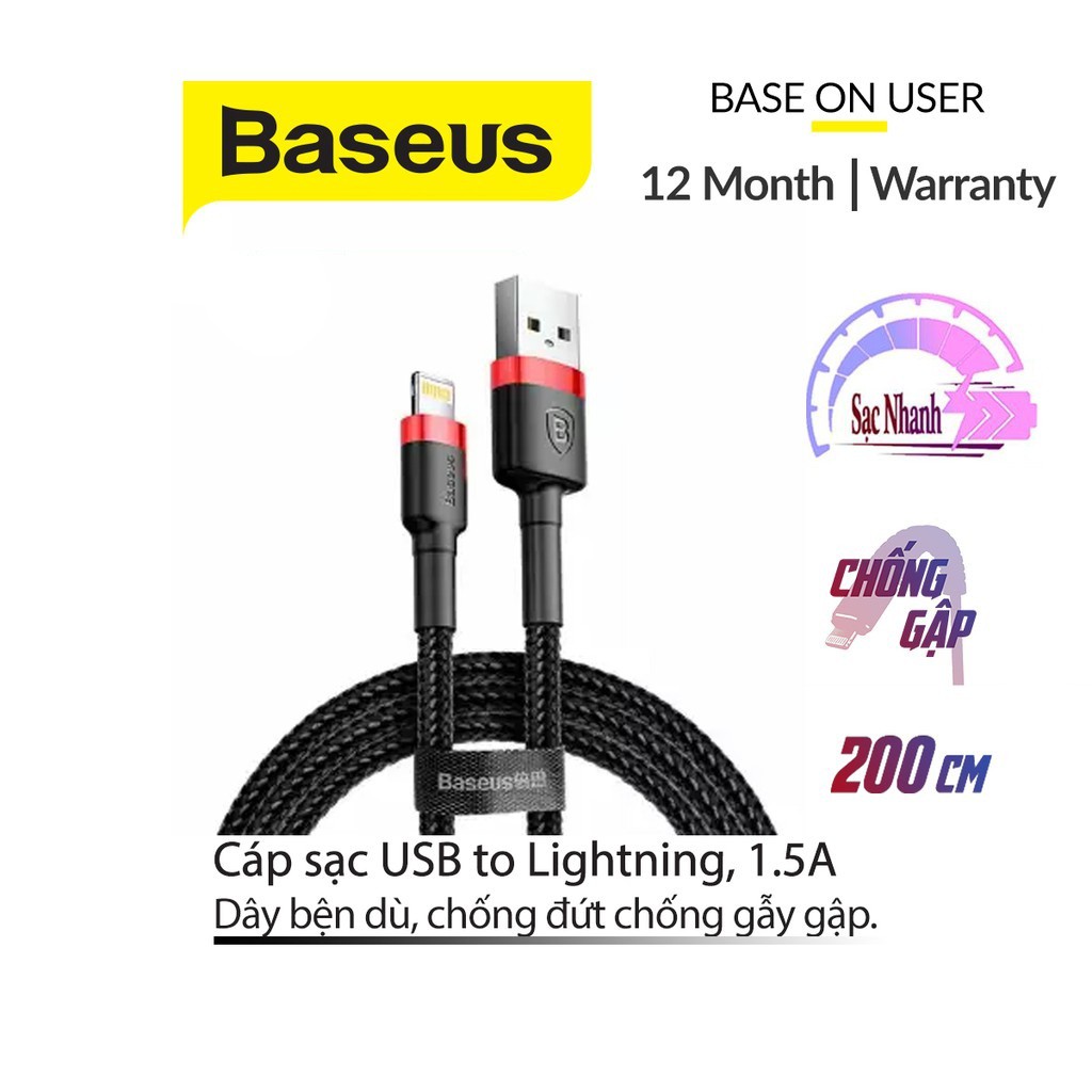 Cáp sạc nhanh Baseus Cafule Lightning dây bện dù chắc chắn hỗ trợ truyền dữ liệu dài 1M/2M/3M cho iPhone/iPad"Bảo hành: 12 tháng, 1 đổi 1 trong tháng đầu nếu lỗi do nhà sản xuất.