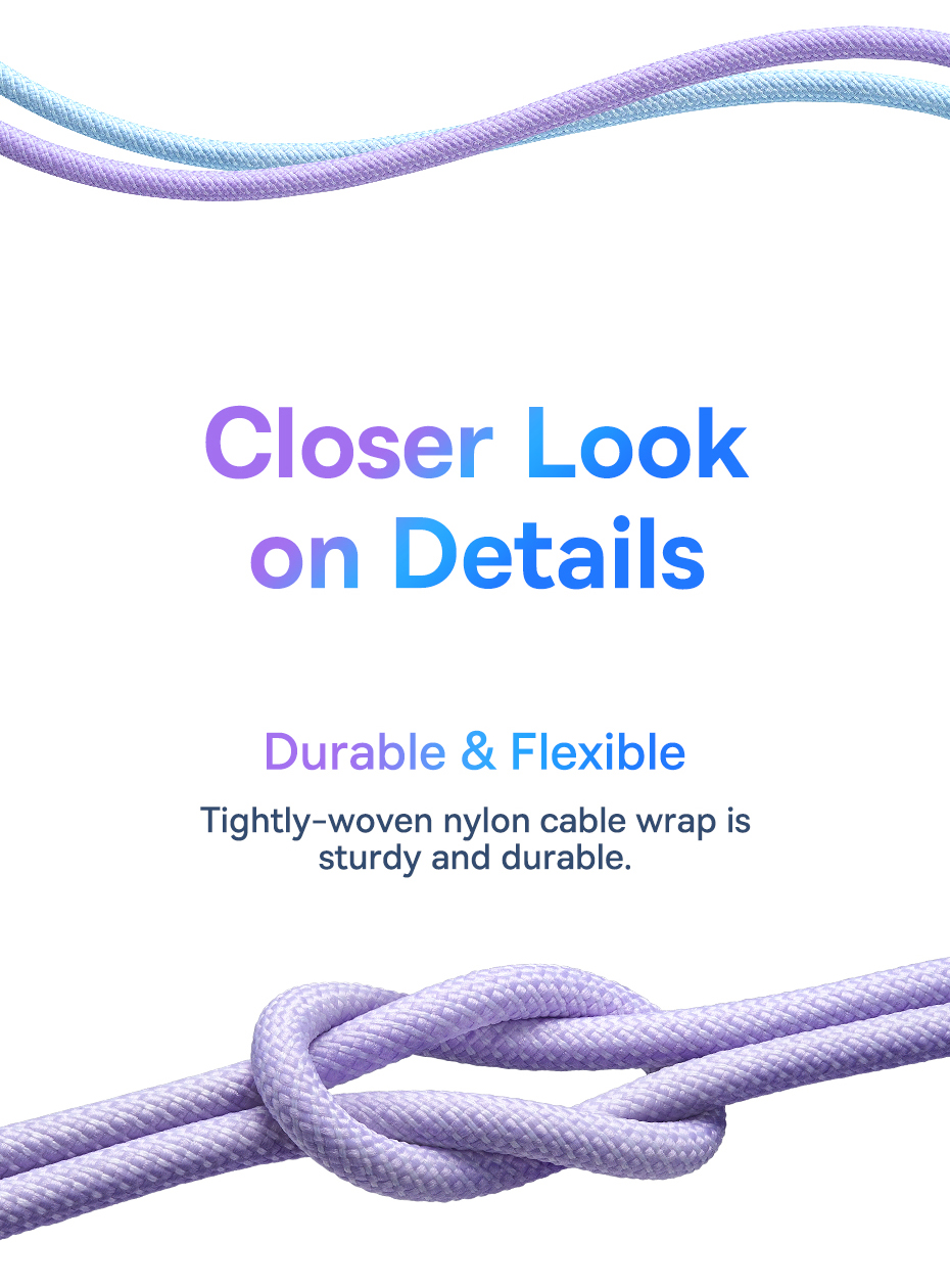 Cáp sạc nhanh này được làm từ chất liệu nylon cao cấp và chịu được nhiều lần uốn cong, kéo dãn mà không gãy hay bị đứt. Điểm đặc biệt của sản phẩm này là thiết kế dạng đuôi cá và màu sắc trẻ trung, phù hợp với nhiều phong cách người dùng.