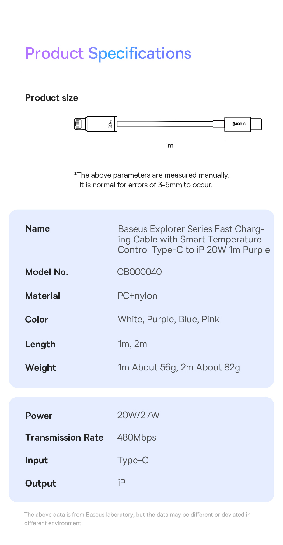 | Tên | Cáp Sạc Nhanh C to iP Baseus Explorer Series Fast Charging Cable with Smart Temperature Control Type-C to iP 20W |