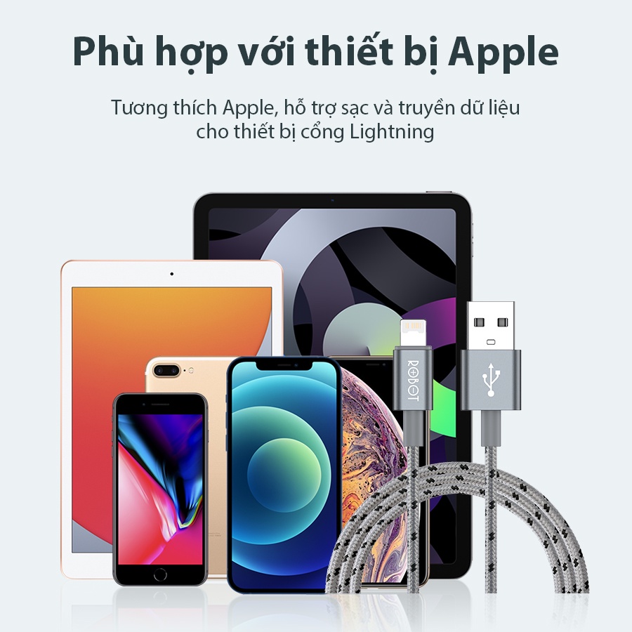 CÁP SẠC NHANH CỔNG LIGHTNING DÀNH CHO CÁC DÒNG THIẾT BỊ IPHONE/ IPAD ROBOT RCL100 - CHẤT LIỆU DÂY BỆN DÙ CHỐNG RỐI - CHIỀU DÀI 1MSản phẩm chính hãng ROBOT