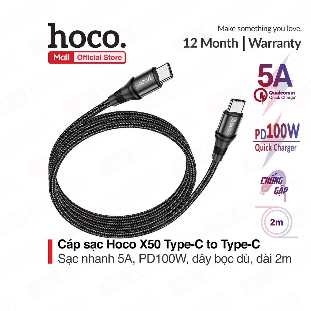 Giới thiệu Cáp sạc nhanh HOCO X50 Type-C to Type-C, sạc nhanh 20V/5A, công suất 100W, dây bọc dù, đầu sạc chống gãy gập, dài 2m