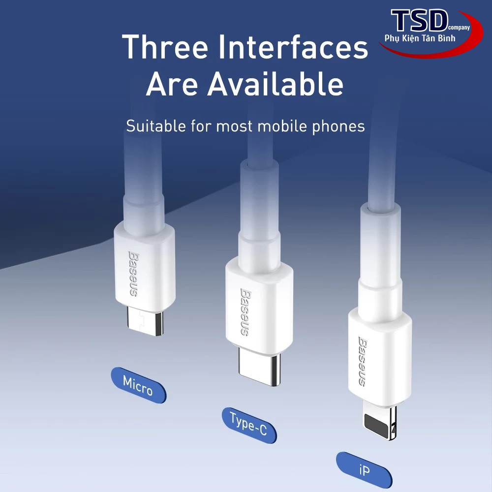 – Cáp Baseus Mini white có ngỏ vào là cổng USB (Type A), ngỏ ra có 3 loại Type C/ Micro và Lightning, phù hợp với mọi loại thiết bị .