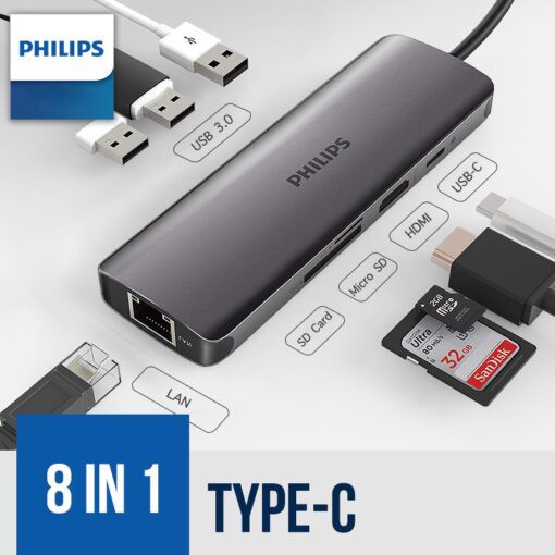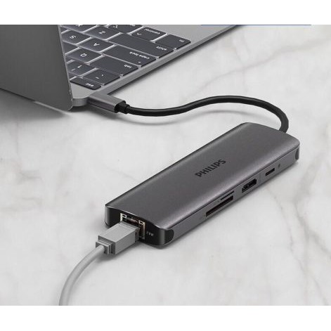 Giới thiệu Cáp Type C -> 3 USB 3.0 +HDMI 4K + Lan RJ45 + Thẻ nhớ micro SD/TF + thẻ nhớ SD Philips DLK 5518C/94 , Chuyển Type C 8in1