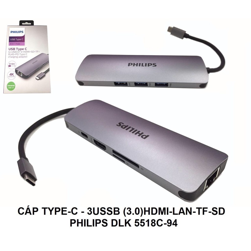 Cáp Type C -> 3 USB 3.0 +HDMI 4K + Lan RJ45 + Thẻ nhớ micro SD/TF + thẻ nhớ SD Philips DLK 5518C/94 , Chuyển Type C 8in1