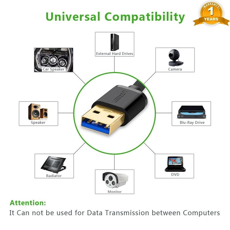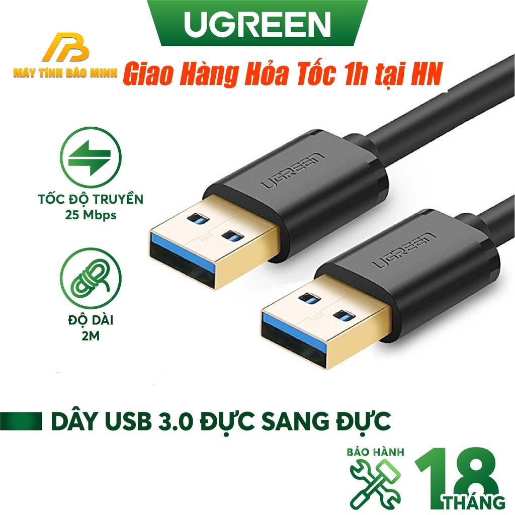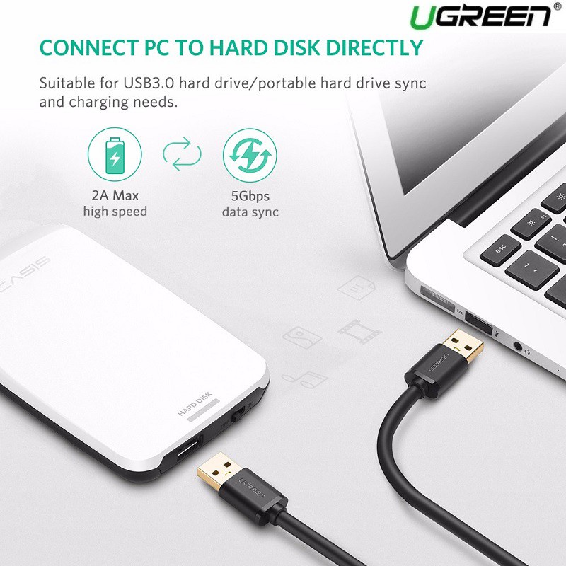 - Cáp USB 3.0 hai đầu đực cao cấp Ugreen Chính Hãng dùng để kết nối máy tính với ổ cứng, quạt tản nhiệt, bộ chia Hub USB hoặc cáp nối dài USB 3.0 và nhiều thiết bị khác, thuận tiện và nhanh chóng với tốc độ truyền tải dữ liêu lên đến 5Gbps.
