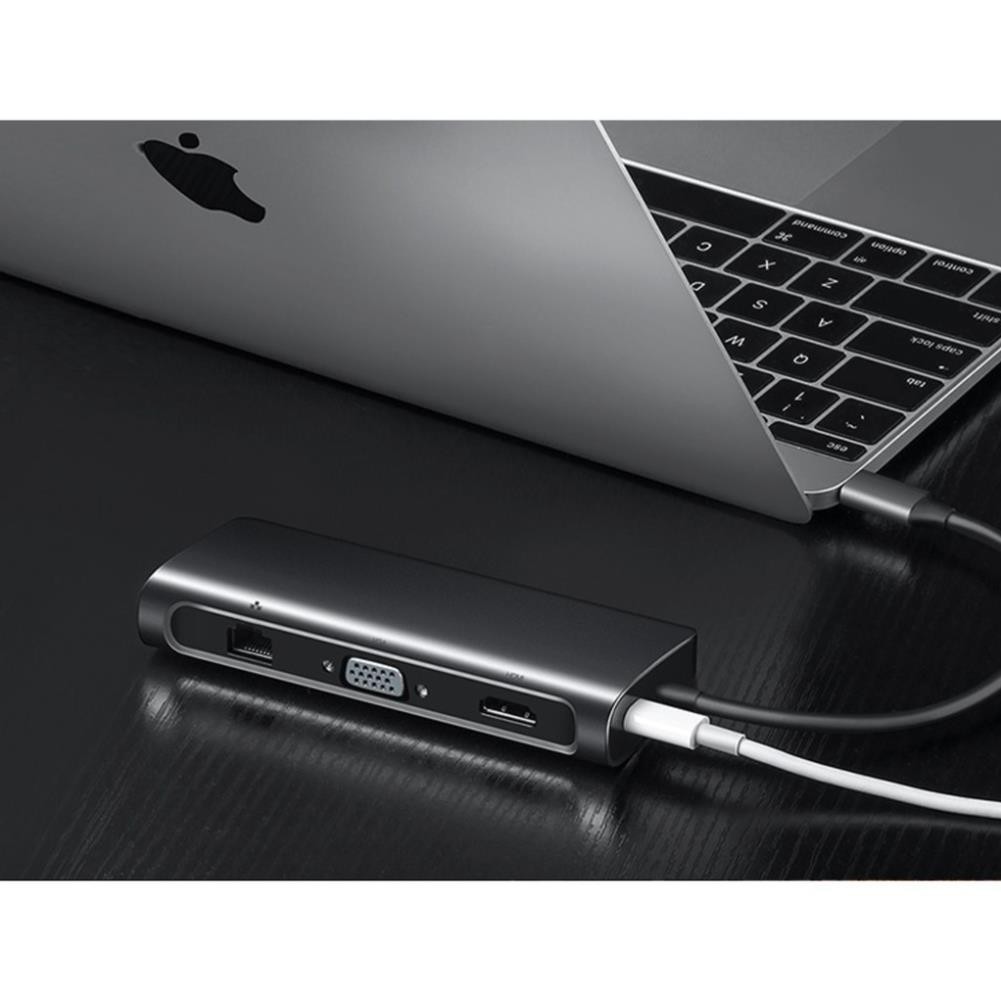 Đầu ra 9 trong 1: HDMI x 1; VGA x1; USB 3.0 x 3; SDcard x 2; RJ 45 x 1; USB-C để sạc