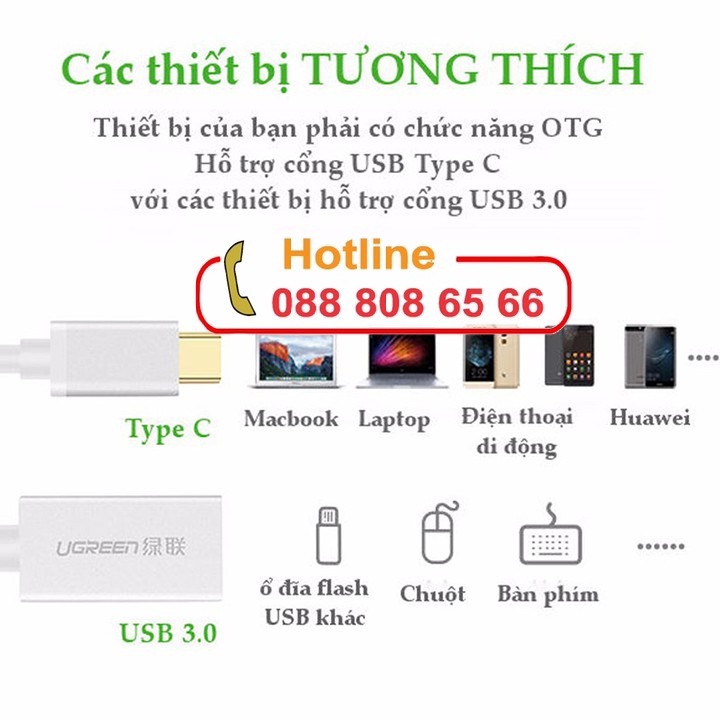 Cáp OTG USB Type C sang USB 3.0 chuẩn A cổng âm Ugreen 30645 cho phép bạn kết nối ổ đĩa flash, bàn phím, chuột, hoặc các tiêu chuẩn USB-A thiết bị của bạn với một thiết bị USB Type C như Apple MacBook mới 12, Google Chromebook, Nokia