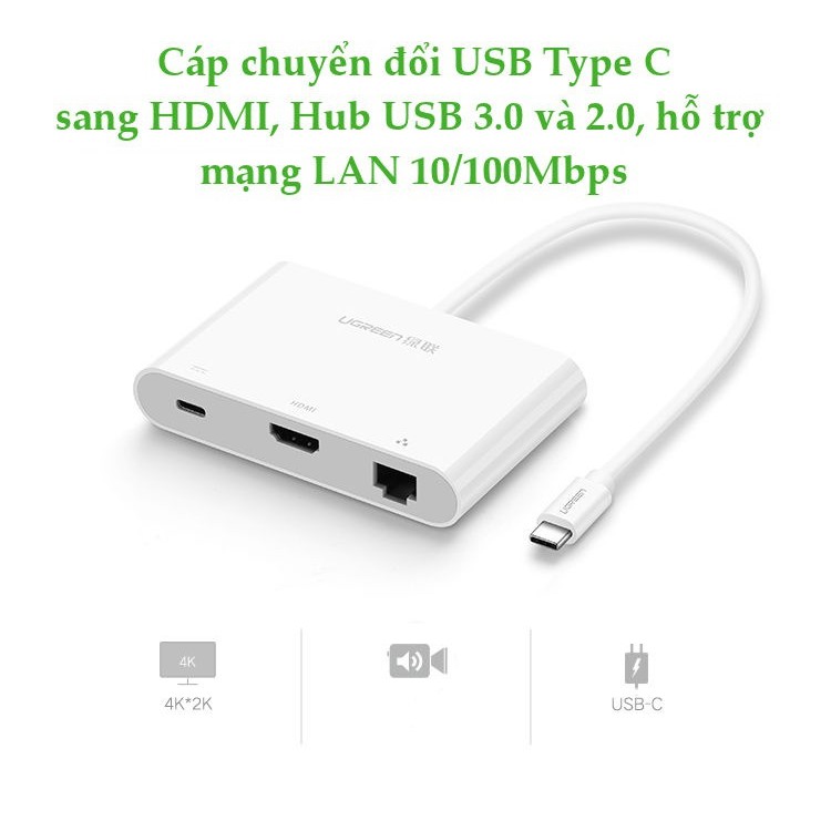 - Cáp chuyển đổi USB-C to HDMI / Ethernet / Hub USB 2.0 Ugreen UG-30439 được thiết kế để kết nối MacBook với cổng USB-C để một hiện HDTV, màn hình hoặc máy chiếu với HDMI với độ phân giải lên đến full HD 1920x1080P )