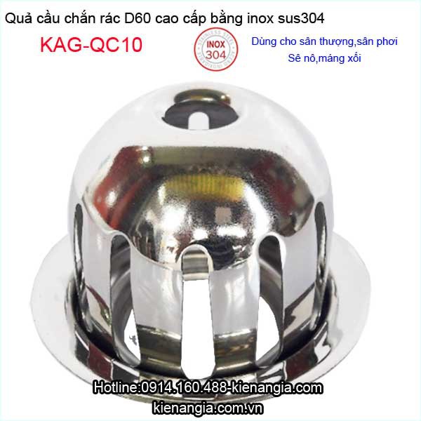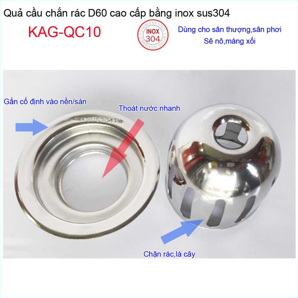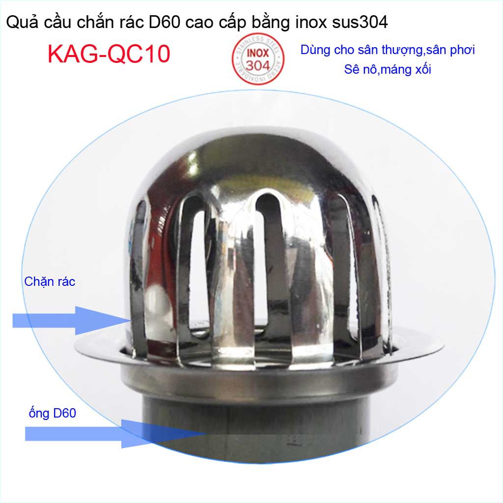 Giới thiệu Cầu chắn rác sân thượng KAG-QC10 inox SUS304, cầu chặn rác đặt miệng ống D60 thoát nước nhanh inox bóng sử dụng tốt