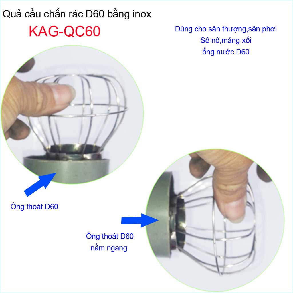 Cầu chặn rác sân thượng KAG-QC60, cầu chắn rác inox 201 thoát nước mưa thả ống D60 xả nhanh chặn rác tốtChất liệu: Cầu chặn rác sân thượng inox, cầu chắn rác D60 KAG-QC60 sản xuất Inox 201 Việt Nam