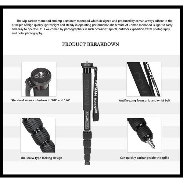 Carbon MonopodTính năng của Coman monopod là nhẹ để mang theo, không gian làm việc hạn chế và sử dụng nhanh, được các nhiếp ảnh gia hoan nghênh trong những dịp như: thể thao, bên ngoài và du lịch.