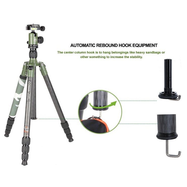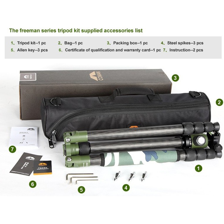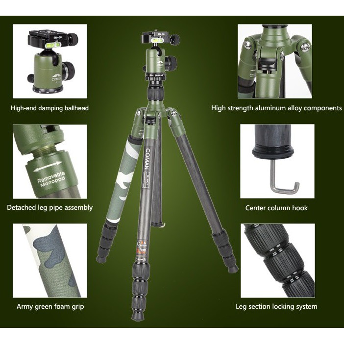 Chân máy Coman Freeman TA140CTN0 được làm bằng sợi carbon tám lớp chất lượng cao nhất. Vật liệu này đảm bảo độ bền và độ tin cậy đặc biệt của sản phẩm cuối cùng.Các chân máy dòng Coman Freeman được thiết kế dành cho các chuyên gia và những người có sở thích chụp ảnh ngoài trời. Chúng được phân biệt bằng một màu xanh lá cây và vỏ của chân kiềng có màu ngụy trang. Chúng là thiết bị hoàn hảo để chụp ảnh động vật hoang dã. Chức năng cao và chất lượng tay nghề cao cho phép sử dụng giá ba chân trong mọi điều kiện.
