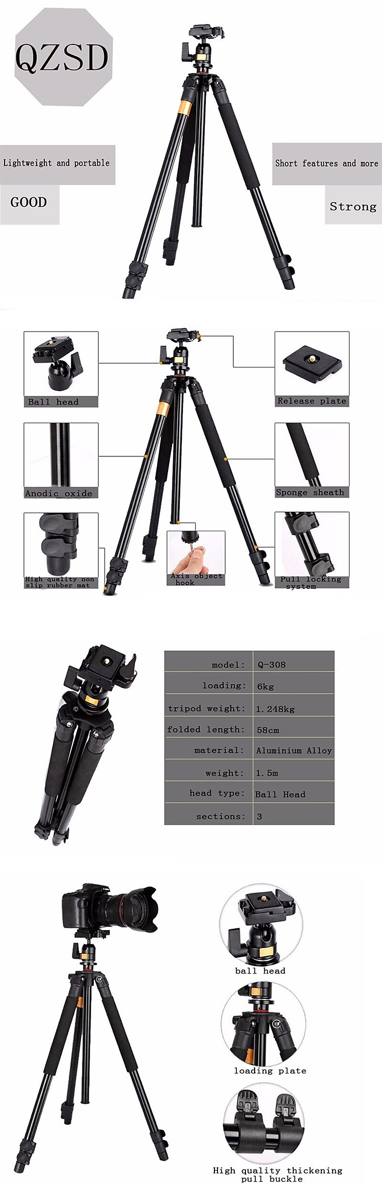Tóm tắt sản phẩm: - Chất liệu :Hợp kim nhôm- số đoạn :3 đoạn- đường kính tối đa: 24mm- đường kính nhỏ nhất :17mm- chiều cao lớn nhất :150CM- Chiều cao nhỏ nhất :56cm- chiều cao khi gấp : 58CM- trọng lượng : 1.24KG- Khả năng chịu tải tối đa: 13kg- Suggestion load :4KG- cách khóa:Flip leg lock- Góc chụp: 360 độ Chi tiết sản phẩm:Chân Máy Beike Q308là sự lựa chọn tốt nhất cho các nhiếp ảnh gia sở hữu dòng máy DSLR với ống kính kit tiêu chuẩn để chụp rất nhiều hình ảnh và quay phim.Chân Máy Beike Q308 là sự lựa chọn hàng đầu cho việc tùy biến, điều khiển khi sử dụng các chức năng của một dòng chân máy ảnh cao cấp không chỉ trong nhà mà còn chụp ngoài trời.