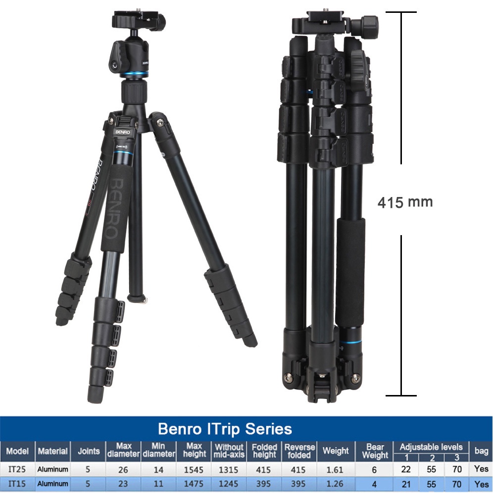 - Benro iTrip IT25 là thiết bị di động với thiết kế từ nguyên liệu nhẹ cũng như tính linh hoạt giúp cho chân máy trở nên gọn gàng hơn, rất tiện dụng khi mang theo bên mình. Chân máy ảnh Benro iTrip IT25 được thiết kế tính năng chân gập ngược độc đáo làm cho các giá đỡ trở nên gọn gàng hơn để dễ dàng cất giữ cũng như mang đi và thiết lập các chân máy một cách dễ dàng. Benro iTrip IT25 có thể được khóa độc lập ở 3 góc độ khác nhau, tăng thêm sự linh hoạt trong khi chụp ở nơi chật chội hay đất không bằng phẳng. Ngoài ra phía dưới trung tâm cột bạn có thể treo thêm 1 túi máy ảnh để bổ sung thêm cho sự ổn định.