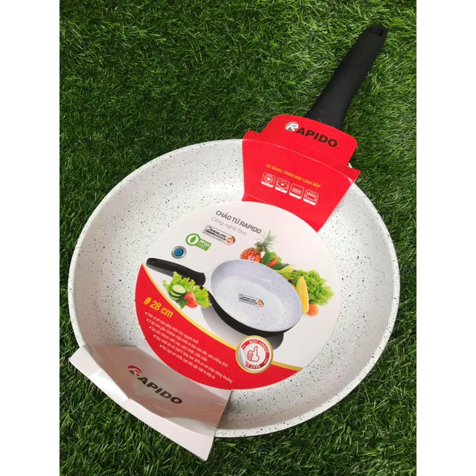 Khác với những loại chảo từ sản xuất theo công nghệ dập khuôn hiện nay, chảo từ Rapido được chế tạo bằng phương pháp đúc nhôm để tạo thành một chiếc chảo nhôm nguyên khối. Ưu điểm của chảo từ Rapido là độ cứng cao, dẫn nhiệt và giữ nhiệt tốt. Từ đó giúp tiết kiệm năng lượng, món ăn chín đều, nhanh hơn, giữ được độ tươi ngon của nguyên liệu. Vì được đúc nguyên khối nên đáy từ không bị phồng đảm bảo độ phẳng tối đa, giúp tiếp xúc với mặt bếp từ tốt nhất.