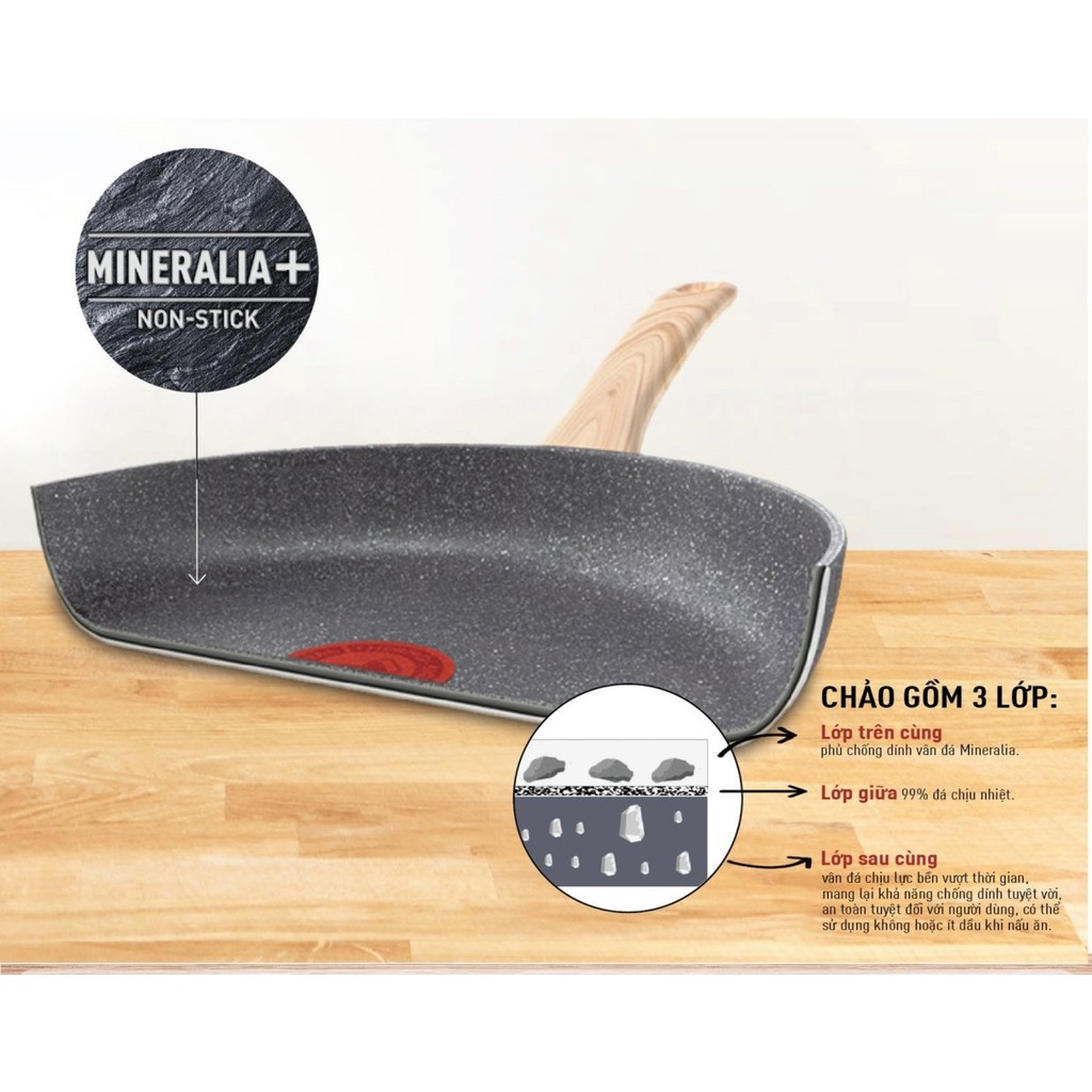 - Chảo gồm 3 lớp, lớp trên cùng phủ chống dính vân đá Mineralia, lớp giữa 99% đá chịu nhiệt, lớp sau cùng vân đá chịu lực bền vượt thời gian, mang lại khả năng chống dính tuyệt vời, an toàn tuyệt đối với người dùng, có thể sử dụng không hoặc ít dầu khi nấu ăn.