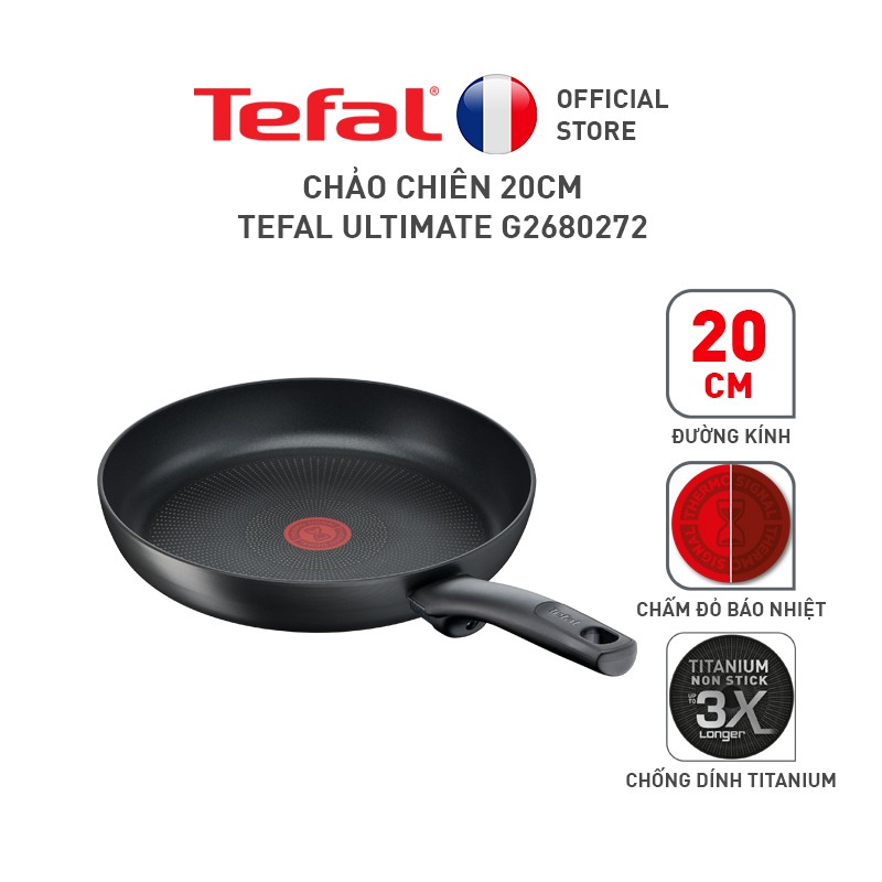 Chảo chiên Tefal Ultimate 20cmLỚP PHỦ TITANIUM Non-Stick Bền chắc với hơn 48,000 lần chà nhám (tương đương 12 năm sử dụng).