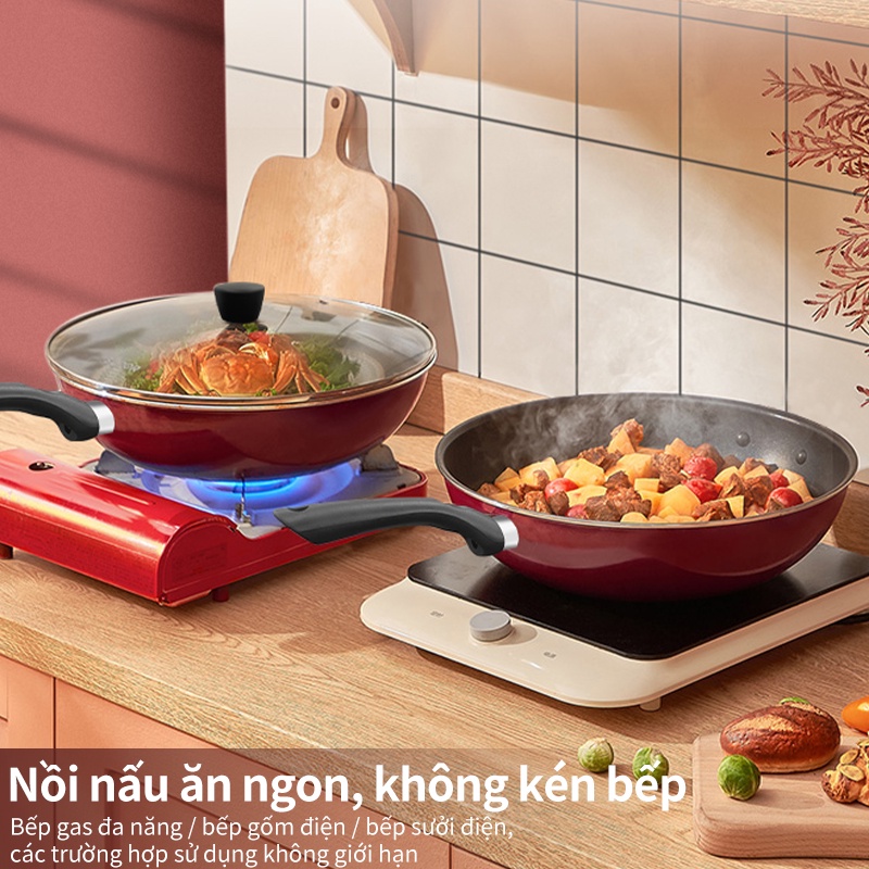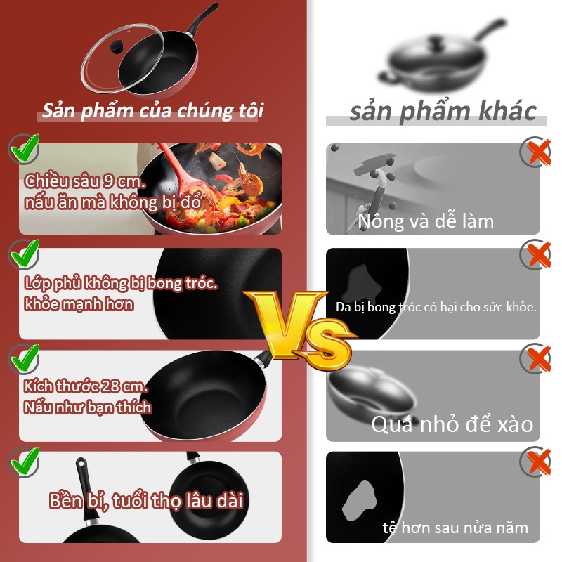 - Danh sách đóng gói: Chảo xào + Tay cầm + Nắp + Hướng dẫn sử dụng.