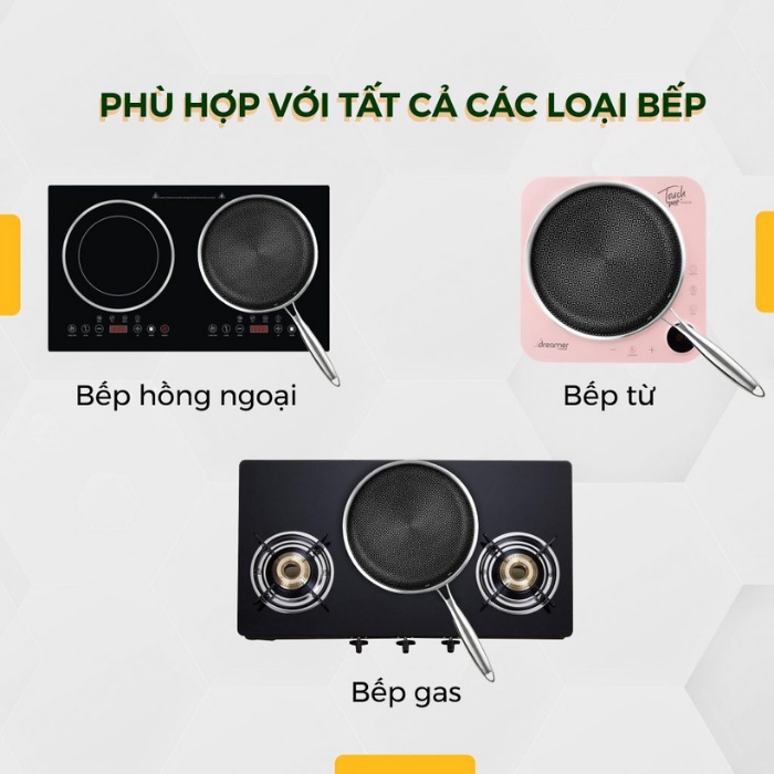 - Chảo chống dính bếp từ vân tổ ong kép có nắp Dreamer DKW-NFL128B có 4 kích thước đa dạng: 20cm / 24cm/ 26cm/ 28cm