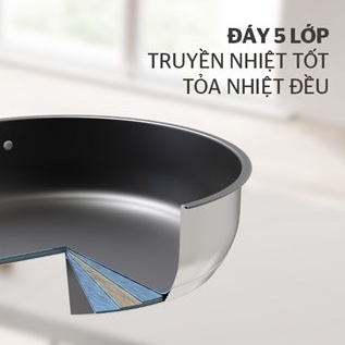 ✅ Nhờ cấu tạo 5 lớp đáy, nhiệt lượng được tỏa đều khắp đáy nồi, giữ nhiệt lâu hơn. Nhờ đó, thức ăn chín đều, giảm cháy khét hiệu quả, đặc biệt giữ được hương vị tự nhiên của thực phẩm.
