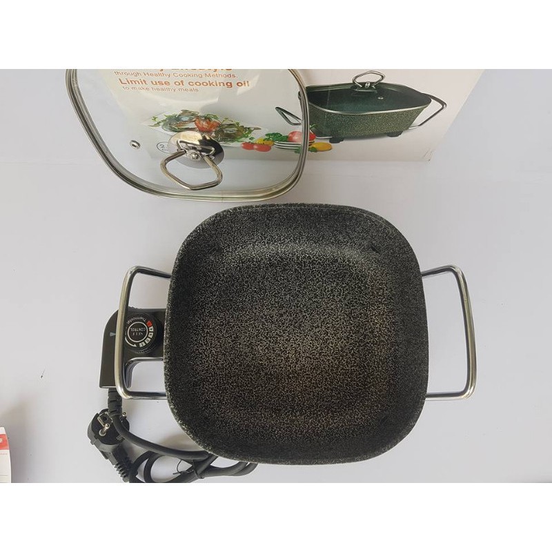 chảo lẩu điện đa năng vân đá Bosco BC-G101 với 3 lớp chống dính, đặc biệt lớp phủ đá hoa cương tăng độ bền cho sản phẩm, không hau dầu mỡ, và không làm dính khi chiên.