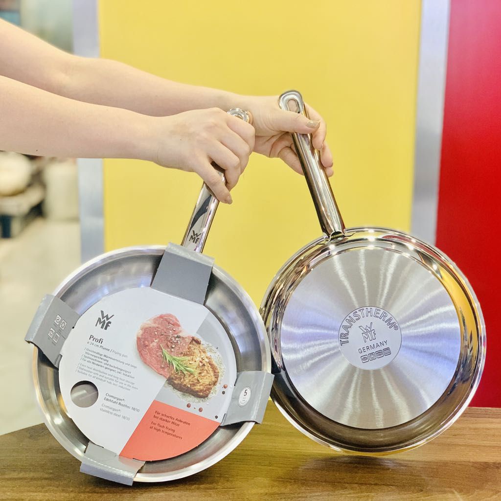 - Chảo WMF Profi với lòng chảo làm bằng thép không gỉ 18/10 có thể chiên, nấu ở nhiệt độ cao mà vẫn an toàn, không bị biến dạng. Với vật liệu được ứng dụng cả trong lĩnh vực y tế, các chị có thể yên tâm chiên rán mà không sợ chảo biến chất làm hại đến sức khỏe qua nhiều năm sử dụng.