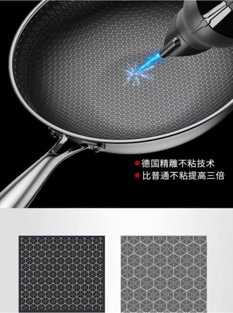 Thiết kế mặt chảo tổ ong, chống dính tự nhiên, xịn cực mà có dùng búi sắt rửa cũng ko bong trầy đâu ý.
