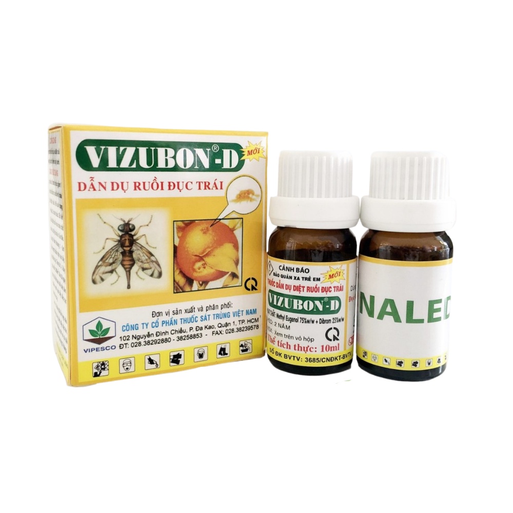 - Vizubon-D là một hỗn hợp gồm hai thành phần: Methyl Eugenol 75% + Dibrom 25%.➖ Sản xuất: Công Ty CP Thuốc Sát Trùng Việt Nam.