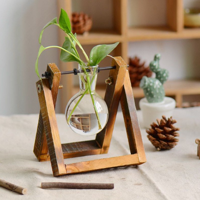 Vật liệu: Khung được làm bằng gỗ tự nhiên, bề mặt có vân; chậu cây thuỷ tinh được làm bằng thủy tinh chịu nhiệt (không dễ bị vỡ).