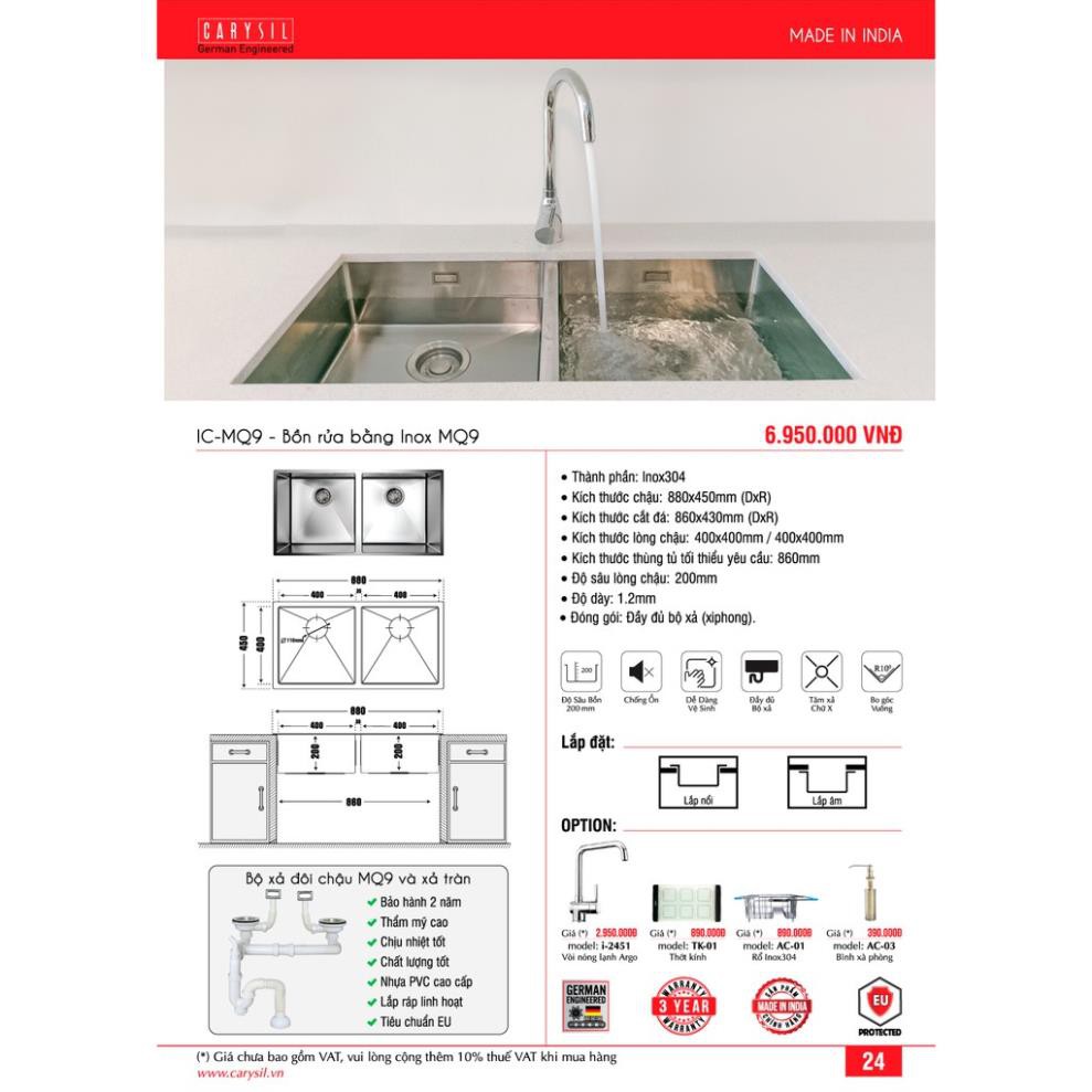 CARYSIL - Chậu Inox304 - Chậu Rửa Bát Chuyên Dùng Lắp Âm Mặt Đá - IC-MQ9 - 880x450mmThông Tin Kỹ Thuật Chậu Rửa Chén Inox304 Carysil IC-MQ9