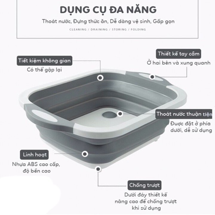 Với chất liệu nhựa cứng PP và silicol dẻo dai chỉ cần kéo tuột lên chiếc thớt thái chặt đồ của b sẽ thành chiếc chậu rửa, và 1 chiếc rổ đựng đồ tiện lợi