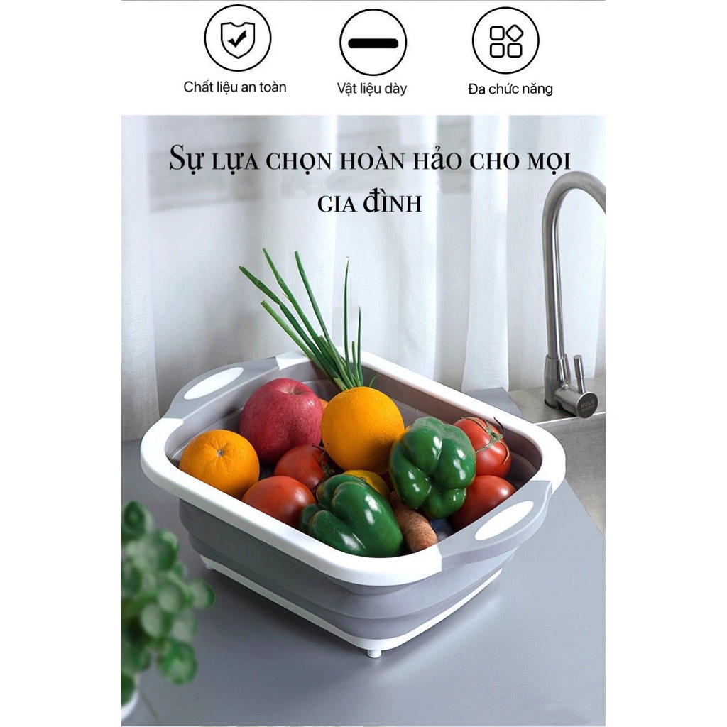 Chậu gấp gọn kiêm thớt đa năng tiện dụng 3 trong 1 kích thước 30 x 40cmThớt là dụng cụ nhà bếp thiết yếu không thể thiếu trong mỗi gia đình. Hiện nay sản phẩm đã được thiết kế mới, đa năng hơn khi không chỉ được dùng để thái, cắt thực phẩm nữa, mà nó còn được sử dụng như một chiếc chậu rửa đồ cũng như rổ đựng thực phẩm.