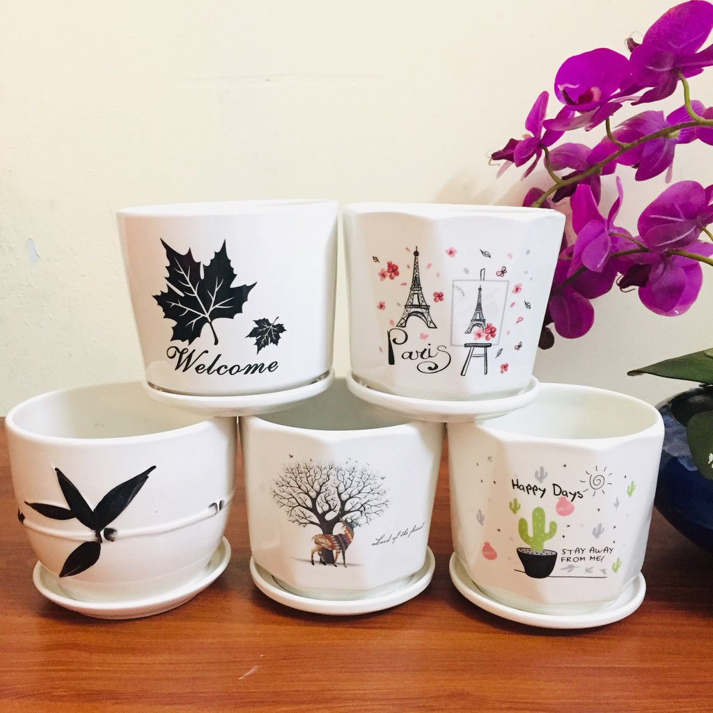 Chậu trồng cây được làm bằng chất liệu sứ tráng men trắng bóng, hình dạng, họa tiết đa dạng, dễ thương, hợp mắt.