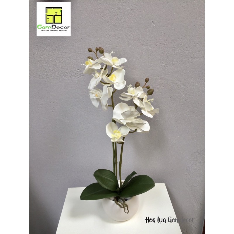 chậu Lan chiều cao khoảng 45- 50cmchất liệu hoa cao su, chậu gốm trắng, 2 nhánh hoa Lan , kèm lá, xốp cắm, sỏi