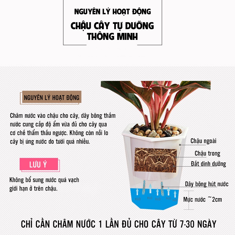 ☘ Thiết kế thông minh 2 lớp giúp chậu có khả năng tự tưới nước cho cây trong khoảng 7-30 ngày.